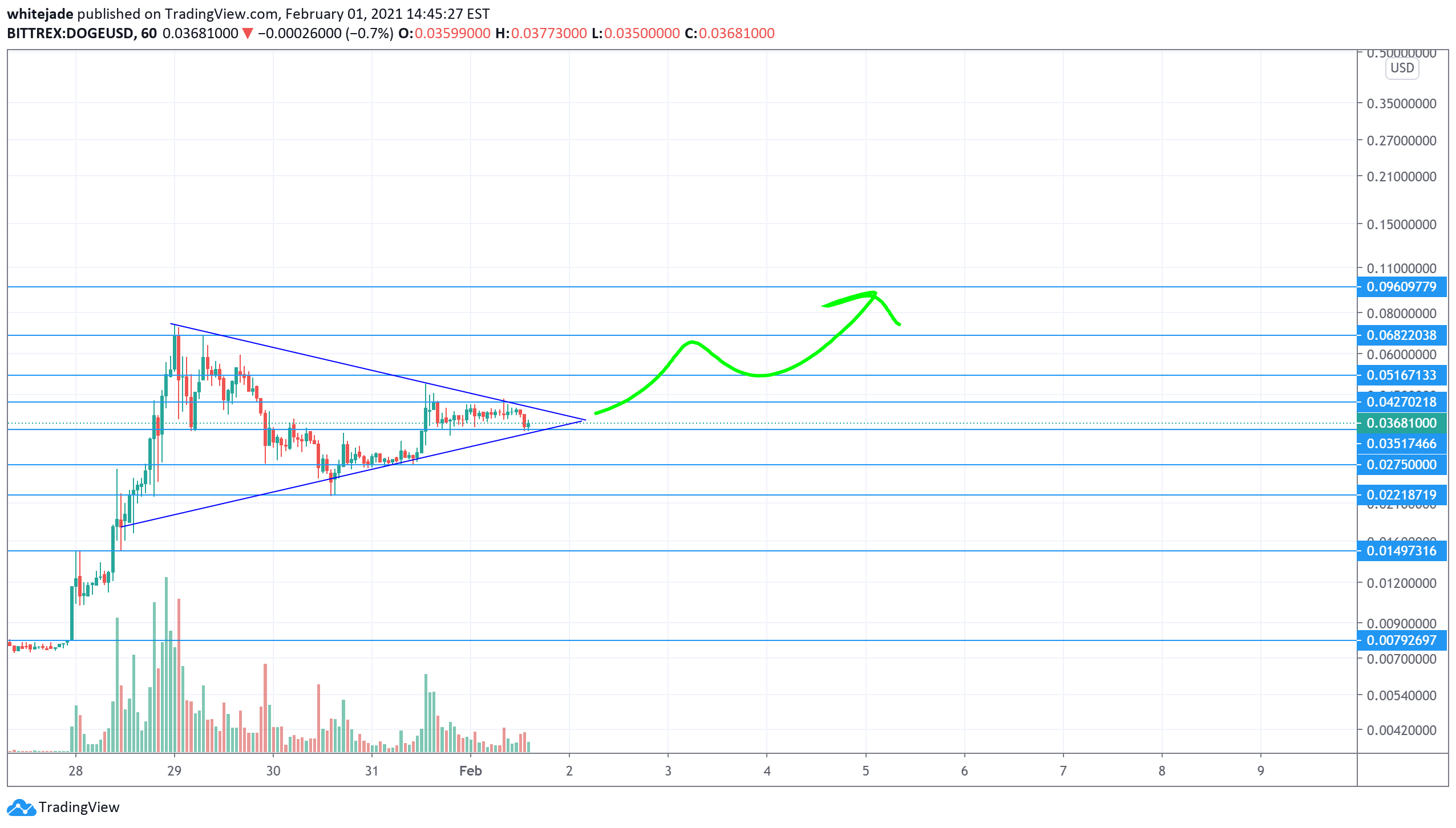 Dogecoin Consoildating And Appearing As Bull Flag For Bittrex Dogeusd By Whitejade Tradingview